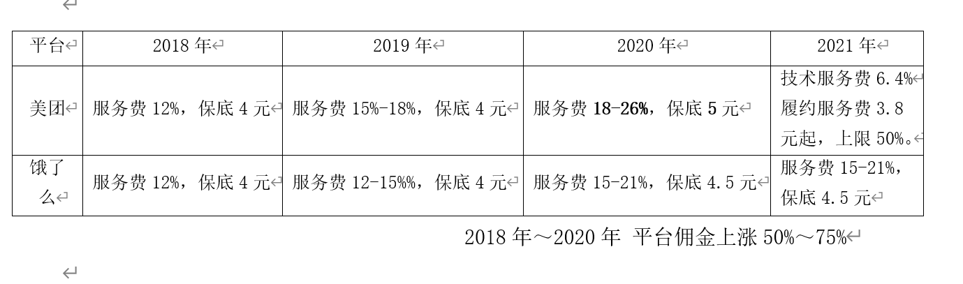 事實上,面對餐飲行業(yè)出現(xiàn)的負增長及從業(yè)人員的呼吁,2021年,美團、餓了么等平臺開始進行費率改革。