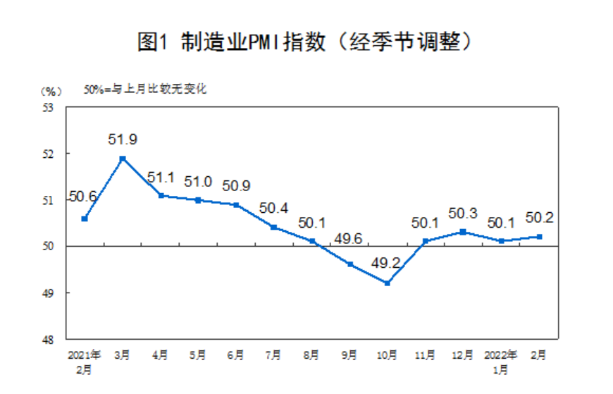據(jù)國家統(tǒng)計(jì)局3月1日消息,2月份,中國制造業(yè)采購經(jīng)理指數(shù)(PMI)為50.2%,比上月上升0.1個百分點(diǎn),繼續(xù)高于臨界點(diǎn),制造業(yè)景氣水平略有上升。