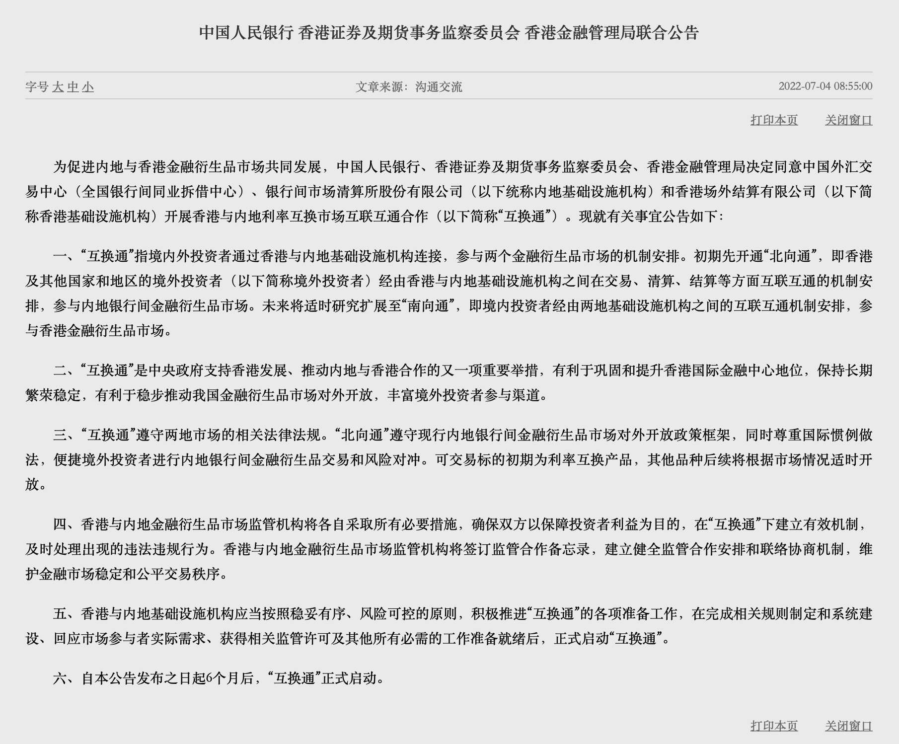 7月4日,中國(guó)人民銀行發(fā)布消息,為促進(jìn)內(nèi)地與香港金融衍生品市場(chǎng)共同發(fā)展,中國(guó)人民銀行、香港證券及期貨事務(wù)監(jiān)察委員會(huì)(下稱“香港證監(jiān)會(huì)”)、香港金融管理局(下稱“香港金管局”)決定同意中國(guó)外匯交易中心(全國(guó)銀行間同業(yè)拆借中心)、銀行間市場(chǎng)清算所股份有限公司和香港場(chǎng)外結(jié)算有限公司開展香港與內(nèi)地利率互換市場(chǎng)互聯(lián)互通合作(下稱“互換通”)。