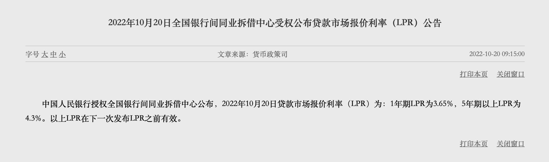 10月20日,最新一期市場報價利率(LPR)出爐。中國人民銀行授權全國銀行間同業(yè)拆借中心公布:1年期LPR為3.65%,5年期以上LPR為4.3%。