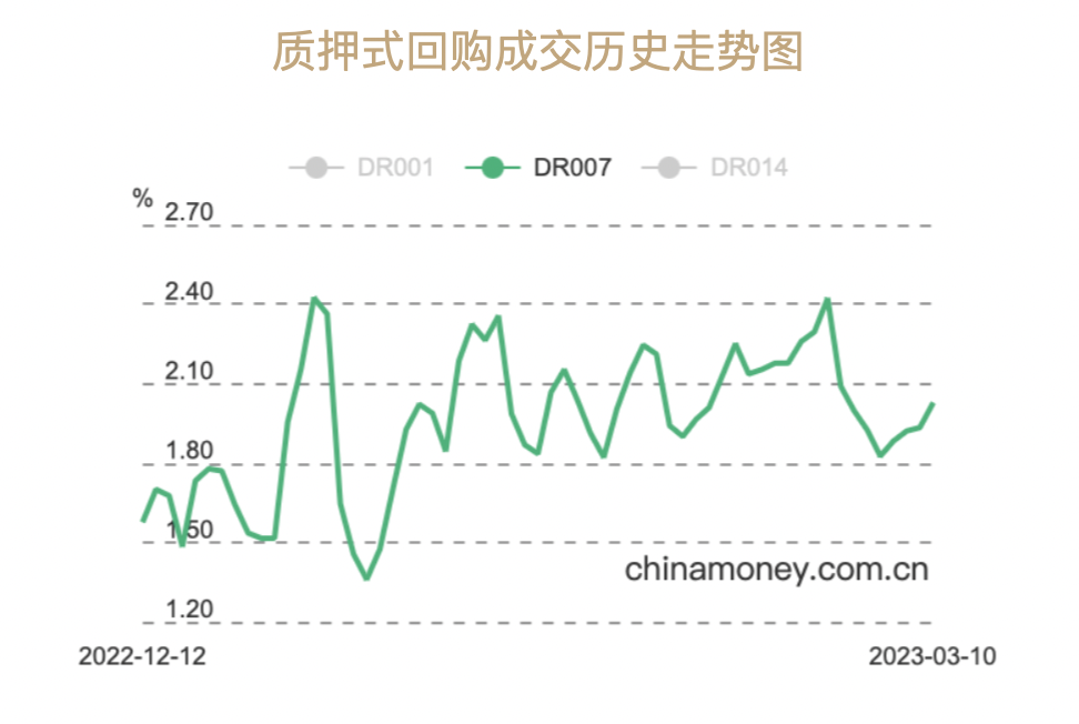 從資金價(jià)格來(lái)看,上周前四個(gè)交易日資金面延續(xù)前一周的寬松局面。據(jù)中國(guó)貨幣網(wǎng)數(shù)據(jù)顯示,3月6日DR007加權(quán)平均利率1.8253%,為本月以來(lái)最低,隨后開始向上。3月10日,DR007加權(quán)平均利率升至政策利率水平(2%)上方報(bào)2.0253%。