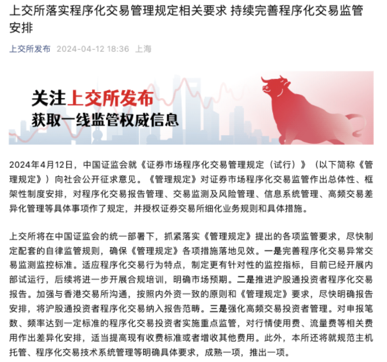 4月12日,中國證監(jiān)會(huì)就《證券市場(chǎng)程序化交易管理規(guī)定(試行)》(以下簡(jiǎn)稱《管理規(guī)定》)向社會(huì)公開征求意見?!豆芾硪?guī)定》對(duì)證券市場(chǎng)程序化交易監(jiān)管作出總體性、框架性制度安排,對(duì)程序化交易報(bào)告管理、交易監(jiān)測(cè)及風(fēng)險(xiǎn)管理、信息系統(tǒng)管理、高頻交易差異化管理等具體事項(xiàng)作了規(guī)定,并授權(quán)證券交易所細(xì)化業(yè)務(wù)規(guī)則和具體措施。