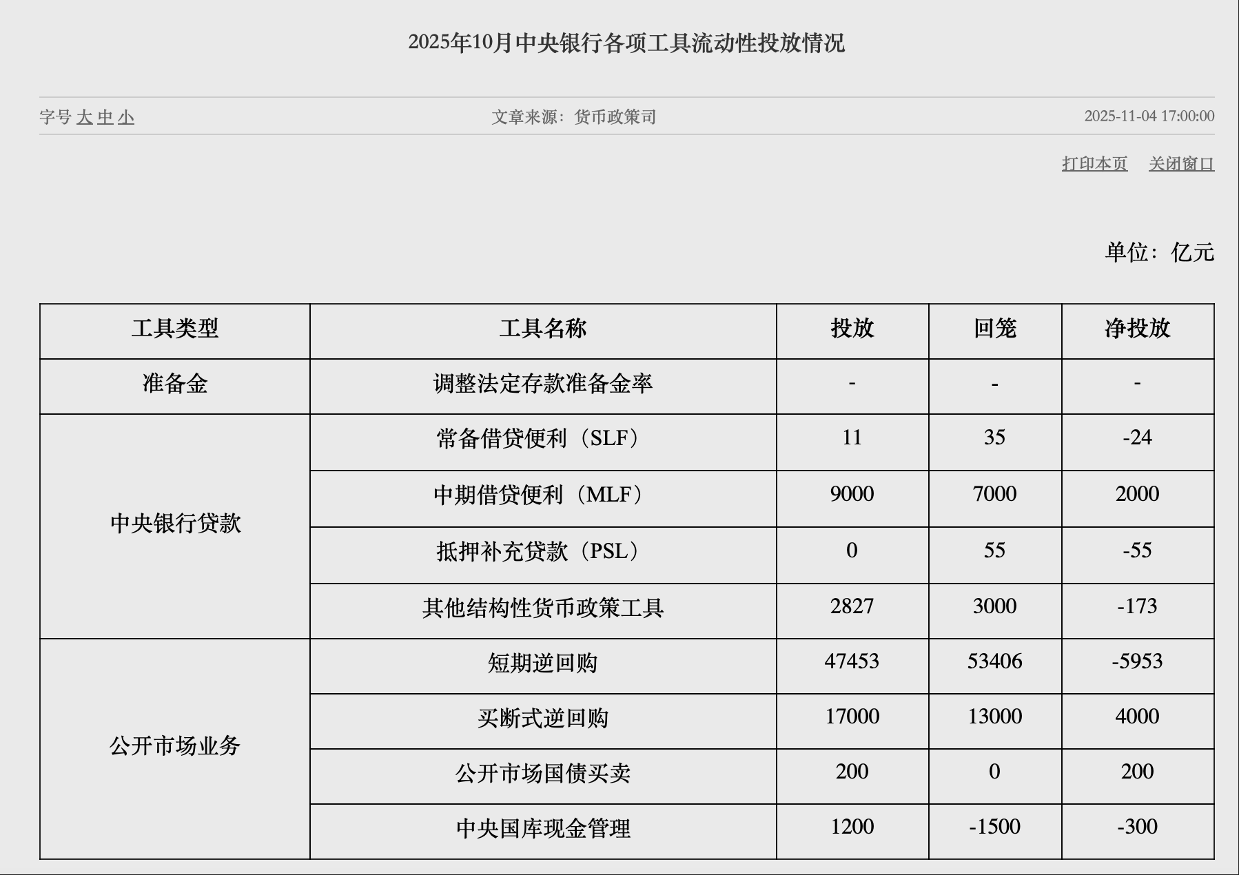 自年初暫停的公開(kāi)市場(chǎng)國(guó)債買(mǎi)賣(mài)操作在10月份已經(jīng)恢復(fù)。11月4日,中國(guó)人民銀行(以下簡(jiǎn)稱(chēng)“央行”)公布2025年10月中央銀行各項(xiàng)工具流動(dòng)性投放情況。數(shù)據(jù)顯示,10月份,央行開(kāi)展公開(kāi)市場(chǎng)國(guó)債買(mǎi)賣(mài)操作,凈投放200億元。