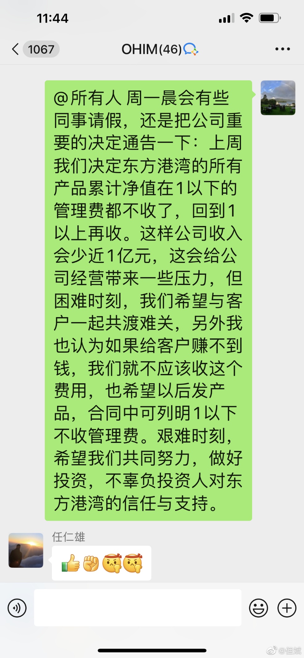 但斌還表示,“另外,我認(rèn)為如果客戶賺不到錢,我們就不應(yīng)該收這個(gè)費(fèi)用,也希望以后發(fā)產(chǎn)品,合同中可列明1以下不收管理費(fèi)。目前我們正在與各渠道溝通協(xié)調(diào),艱難時(shí)刻,希望我們共同努力,做好投資,不辜負(fù)投資人對(duì)東方港灣的信任與支持。”