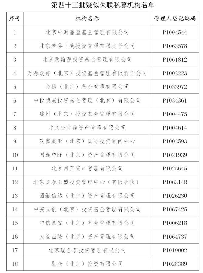 3月1日,中國(guó)證券投資基金業(yè)協(xié)會(huì)(以下簡(jiǎn)稱(chēng)“中基協(xié)”)發(fā)布公告稱(chēng),近期,中基協(xié)在日常工作中發(fā)現(xiàn)70家疑似失聯(lián)私募機(jī)構(gòu)(附件),通過(guò)該70家私募機(jī)構(gòu)在資產(chǎn)管理業(yè)務(wù)綜合報(bào)送平臺(tái)(以下簡(jiǎn)稱(chēng)AMBERS系統(tǒng))中登記的固定電話、手機(jī)號(hào)碼、電子郵件等聯(lián)系方式無(wú)法與其取得有效聯(lián)系。