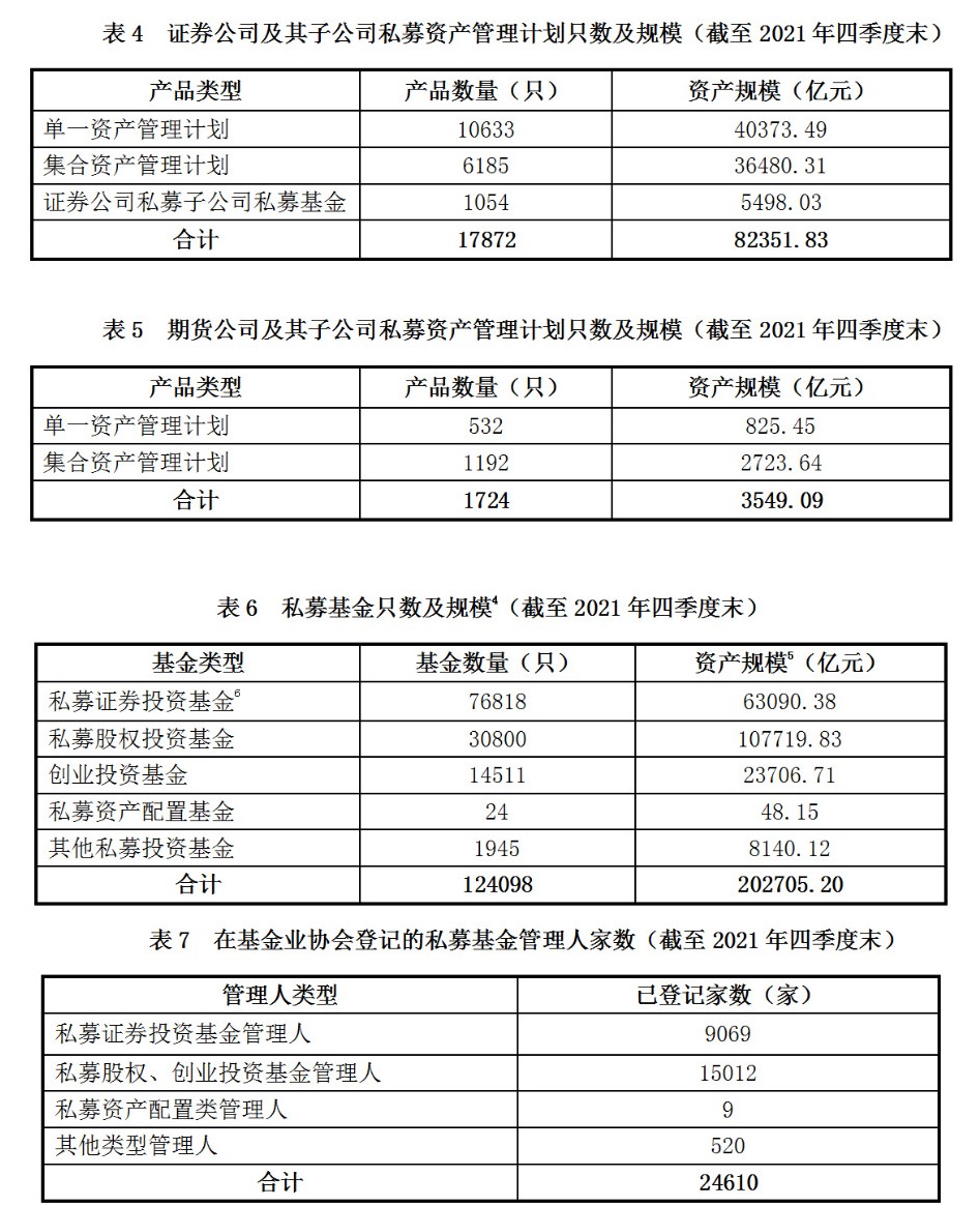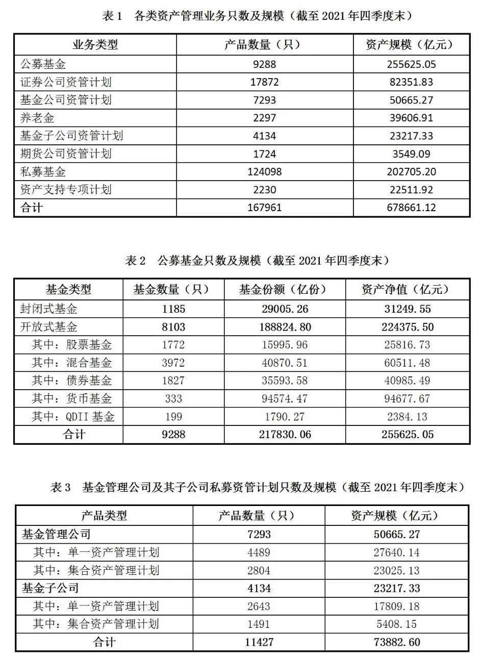 截至2021年四季度末,基金管理公司及其子公司、證券公司、期貨公司、私募基金管理機(jī)構(gòu)資產(chǎn)管理業(yè)務(wù)總規(guī)模約67.87萬(wàn)億元,其中,公募基金規(guī)模25.56萬(wàn)億元,證券公司及其子公司私募資產(chǎn)管理業(yè)務(wù)規(guī)模8.24萬(wàn)億元,基金管理公司及其子公司私募資產(chǎn)管理業(yè)務(wù)規(guī)模7.39萬(wàn)億元,基金公司管理的養(yǎng)老金規(guī)模3.96萬(wàn)億元,期貨公司及其子公司私募資產(chǎn)管理業(yè)務(wù)規(guī)模約3549億元,私募基金規(guī)模20.27萬(wàn)億元,資產(chǎn)支持專項(xiàng)計(jì)劃規(guī)模2.25萬(wàn)億元。