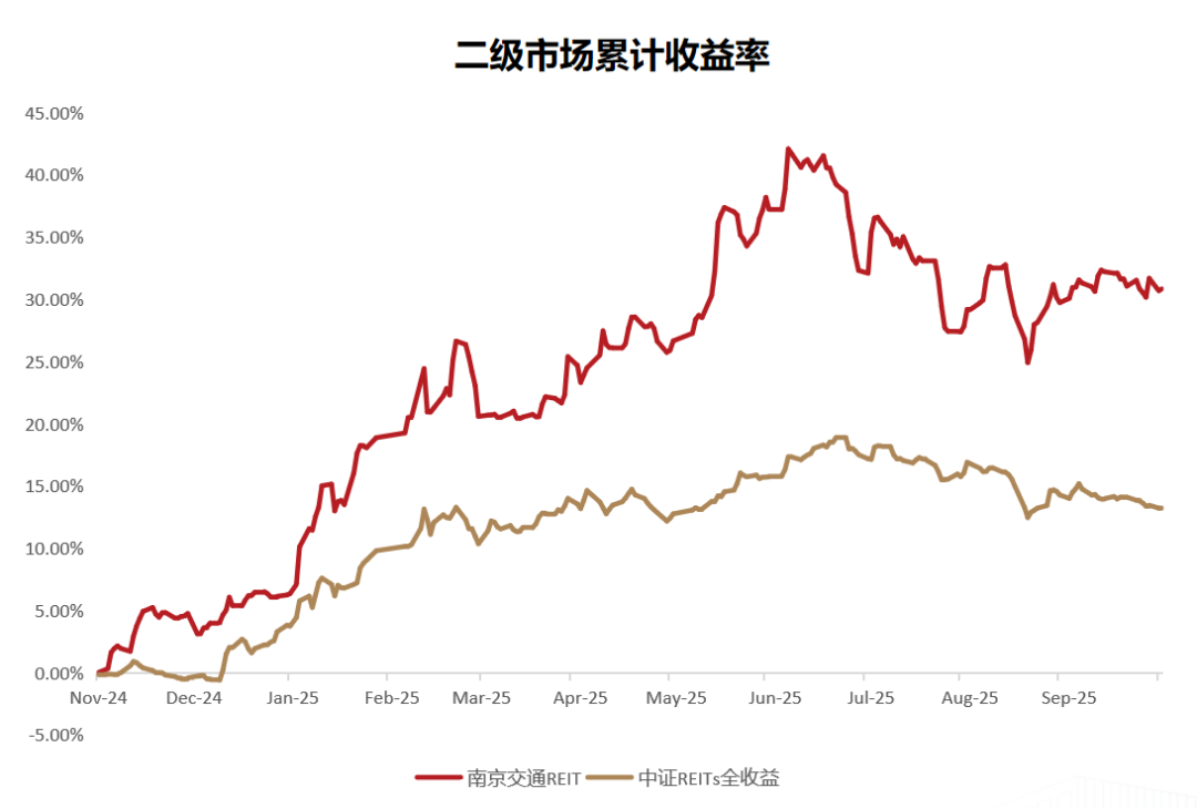 二級(jí)市場(chǎng)穩(wěn)健顯優(yōu)勢(shì):截至2025年9月30日,產(chǎn)品上市以來二級(jí)市場(chǎng)漲幅為30.84%,本產(chǎn)品二級(jí)市場(chǎng)漲幅領(lǐng)先中證REITs全收益指數(shù)(13.18%),是投資者積極配置的優(yōu)質(zhì)標(biāo)的,展現(xiàn)了市場(chǎng)對(duì)本產(chǎn)品經(jīng)營能力對(duì)長(zhǎng)期價(jià)值的認(rèn)可。