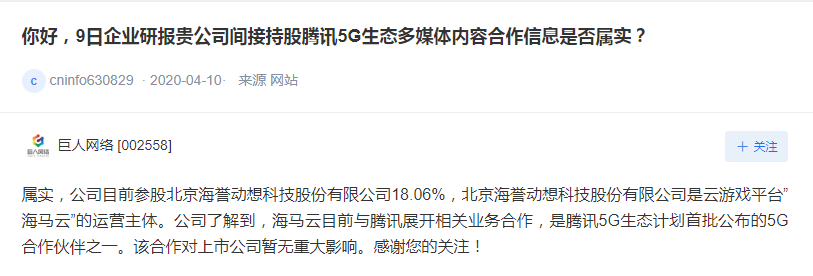 4月30日,巨人網(wǎng)絡在互動易上回復投資者關于是否間接持股騰訊5G生態(tài)合作伙伴海馬云,稱屬實。目前巨人持有北京海譽動想科技股份有限公司(簡稱“北京海譽動想”)18.06%的股份,海馬云是后者旗下產(chǎn)品。