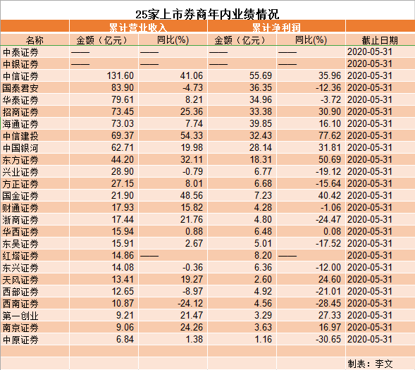 從年內(nèi)業(yè)績表現(xiàn)來看,前5個月,目前有數(shù)據(jù)可查的23家上市券商共計(jì)實(shí)現(xiàn)凈利潤854億元,實(shí)現(xiàn)凈利潤355億元。目前來看,中信證券業(yè)績大幅領(lǐng)先其他券商位居第一,實(shí)現(xiàn)營收131.6億元,凈利潤55.7億元,分別同比增長41%、36%。