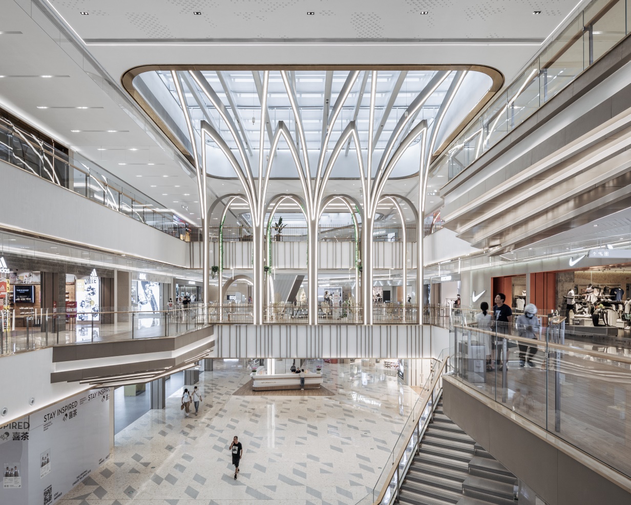 廈門集美世茂廣場(chǎng)中庭大面積天窗,保證室內(nèi)充足光線;同時(shí)通過設(shè)置內(nèi)遮陽(yáng)及彩釉點(diǎn),又有效保證了中庭溫度適宜,極大地減少了商場(chǎng)的能耗,注入環(huán)保設(shè)計(jì)理念。