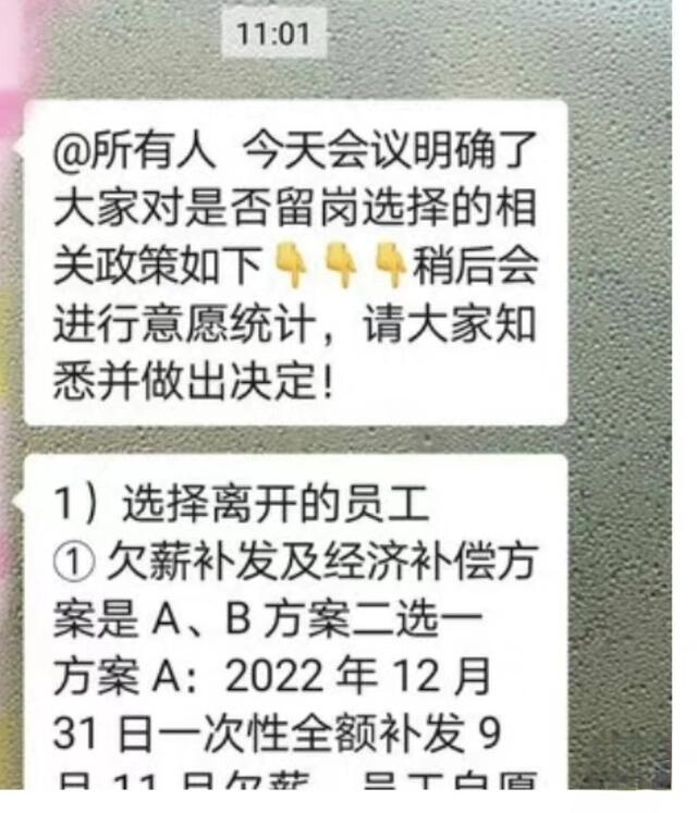 針對(duì)解決欠薪問題的進(jìn)展,一位國(guó)美中層人士向《證券日?qǐng)?bào)》記者透露,公司內(nèi)部通知,給出了三個(gè)選擇,對(duì)于選擇離開員工而言,其有A、B兩個(gè)方案可以選擇:一是選擇離開,2022年12月31日一次性全額補(bǔ)發(fā)9月份至11月份欠薪,員工自愿放棄本次經(jīng)濟(jì)補(bǔ)償;二是等待賠償,2023年3月31日,國(guó)美將補(bǔ)發(fā)欠薪并支付全數(shù)補(bǔ)償。對(duì)于繼續(xù)留職員工,員工需同意與新公司主體重新簽訂勞動(dòng)合同,2022年12月31日一次性全額補(bǔ)發(fā)9月份至11月份欠薪,員工自愿放棄對(duì)本次經(jīng)濟(jì)補(bǔ)償金的追討,并自12月份起執(zhí)行新的薪酬績(jī)效方案。