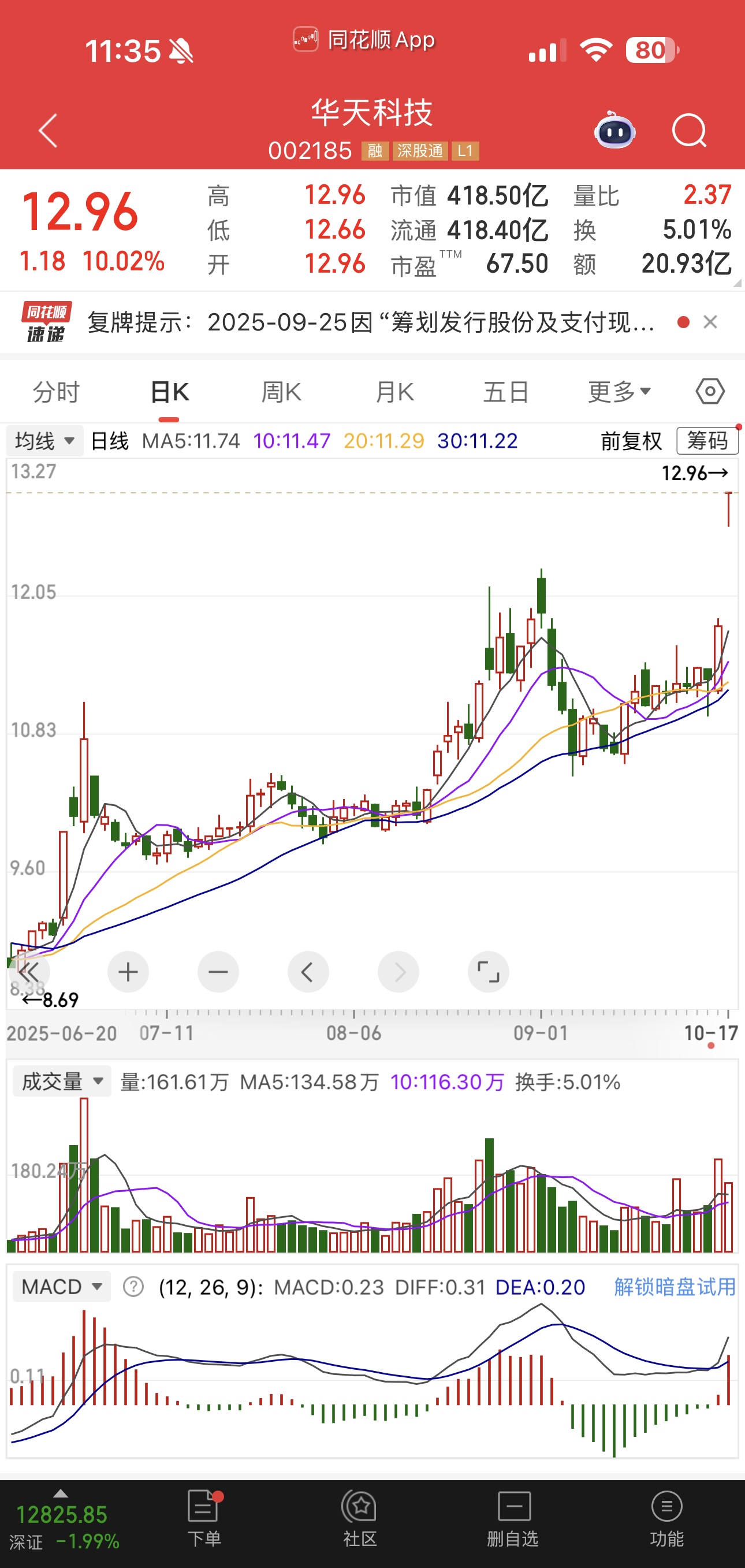 10月17日,天水華天科技股份有限公司(以下簡稱“華天科技”)復(fù)牌,開盤后漲停。截至中午收盤,封漲停價12.96元/股,漲幅為10.02%,總市值達(dá)418.5億元。