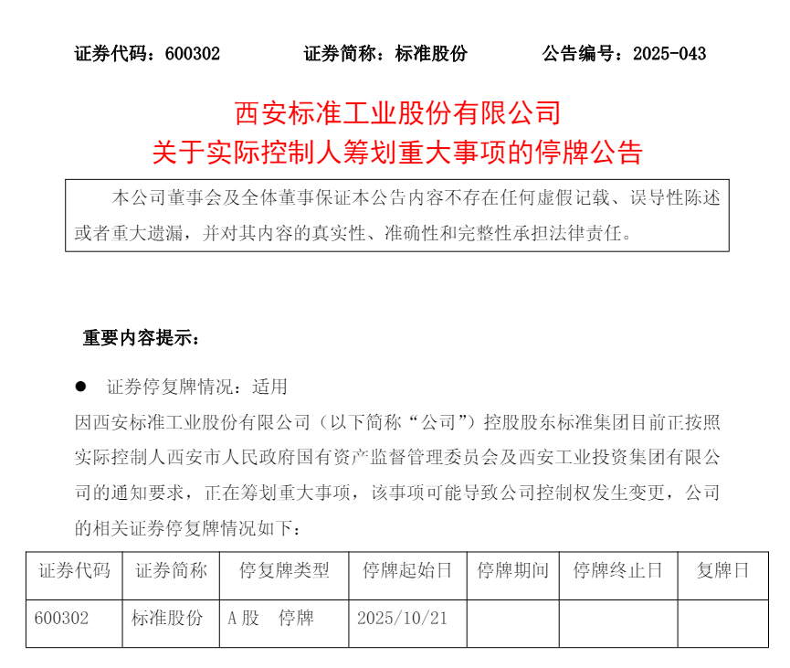 10月20日晚間,西安標(biāo)準(zhǔn)工業(yè)股份有限公司(以下簡稱“標(biāo)準(zhǔn)股份”,證券代碼:600302)發(fā)布公告稱,公司控股股東標(biāo)準(zhǔn)集團(tuán)目前正按照實(shí)際控制人西安市人民政府國有資產(chǎn)監(jiān)督管理委員會(huì)及西安工業(yè)投資集團(tuán)有限公司的通知要求,籌劃重大事項(xiàng),該事項(xiàng)可能導(dǎo)致公司控制權(quán)發(fā)生變更。為保證公平信息披露,維護(hù)投資者利益,避免造成公司股價(jià)異常波動(dòng),公司股票于10月21日(星期二)起停牌,預(yù)計(jì)停牌時(shí)間不超過2個(gè)交易日。
