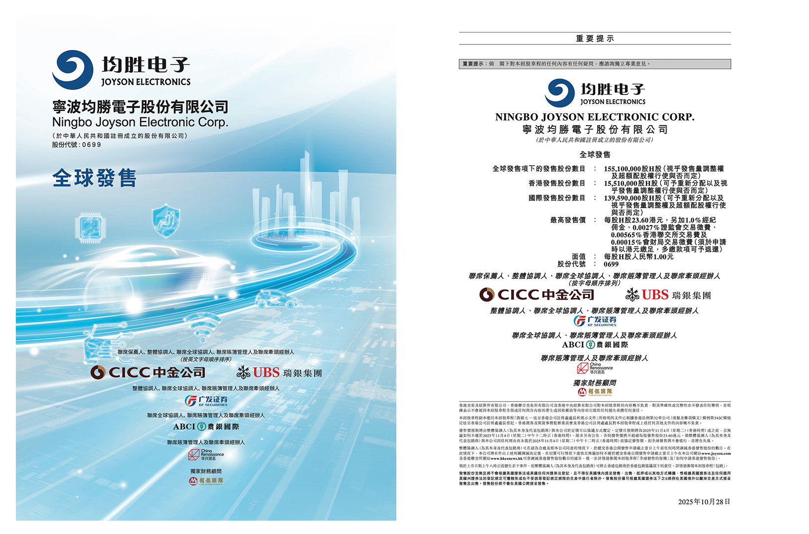 本報訊 (記者吳奕萱)10月28日,智能汽車科技解決方案提供商寧波均勝電子股份有限公司(以下簡稱“均勝電子”)正式開啟港股招股,招股期持續(xù)至11月3日,計劃于11月6日正式以“0699”為股票代碼在港交所主板掛牌。成功上市后,均勝電子將成為“A+H”兩地上市的“汽車+機器人Tier1”雙龍頭企業(yè)。