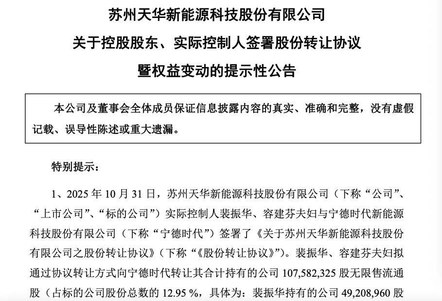 10月31日晚間,蘇州天華新能源科技股份有限公司(以下簡(jiǎn)稱(chēng)“天華新能”,證券代碼:300390)發(fā)布公告,公司實(shí)際控制人裴振華、容建芬夫婦與寧德時(shí)代新能源科技股份有限公司(以下簡(jiǎn)稱(chēng)“寧德時(shí)代”,證券代碼:300750)簽署股份轉(zhuǎn)讓協(xié)議,前者擬通過(guò)協(xié)議轉(zhuǎn)讓方式向?qū)幍聲r(shí)代轉(zhuǎn)讓合計(jì)1.08億股無(wú)限售流通股,占天華新能股份總數(shù)的12.95%,轉(zhuǎn)讓總價(jià)高達(dá)26.35億元,每股轉(zhuǎn)讓價(jià)格為24.49元。交易完成后,寧德時(shí)代將持有天華新能13.54%的股份,成為其重要戰(zhàn)略股東。