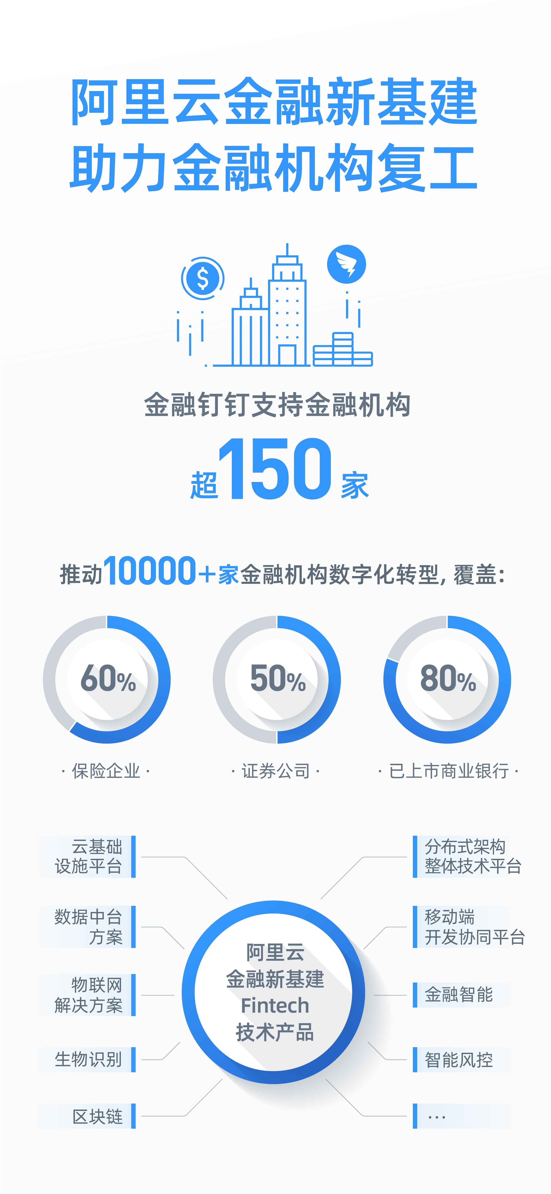 來(lái)自阿里云的信息顯示,截止到3月底,已經(jīng)有超過(guò)150家銀行、保險(xiǎn)、證券等金融機(jī)構(gòu)使用阿里云金融釘釘、云營(yíng)業(yè)廳等解決方案復(fù)工復(fù)產(chǎn),保障金融業(yè)務(wù)的正常運(yùn)行。
