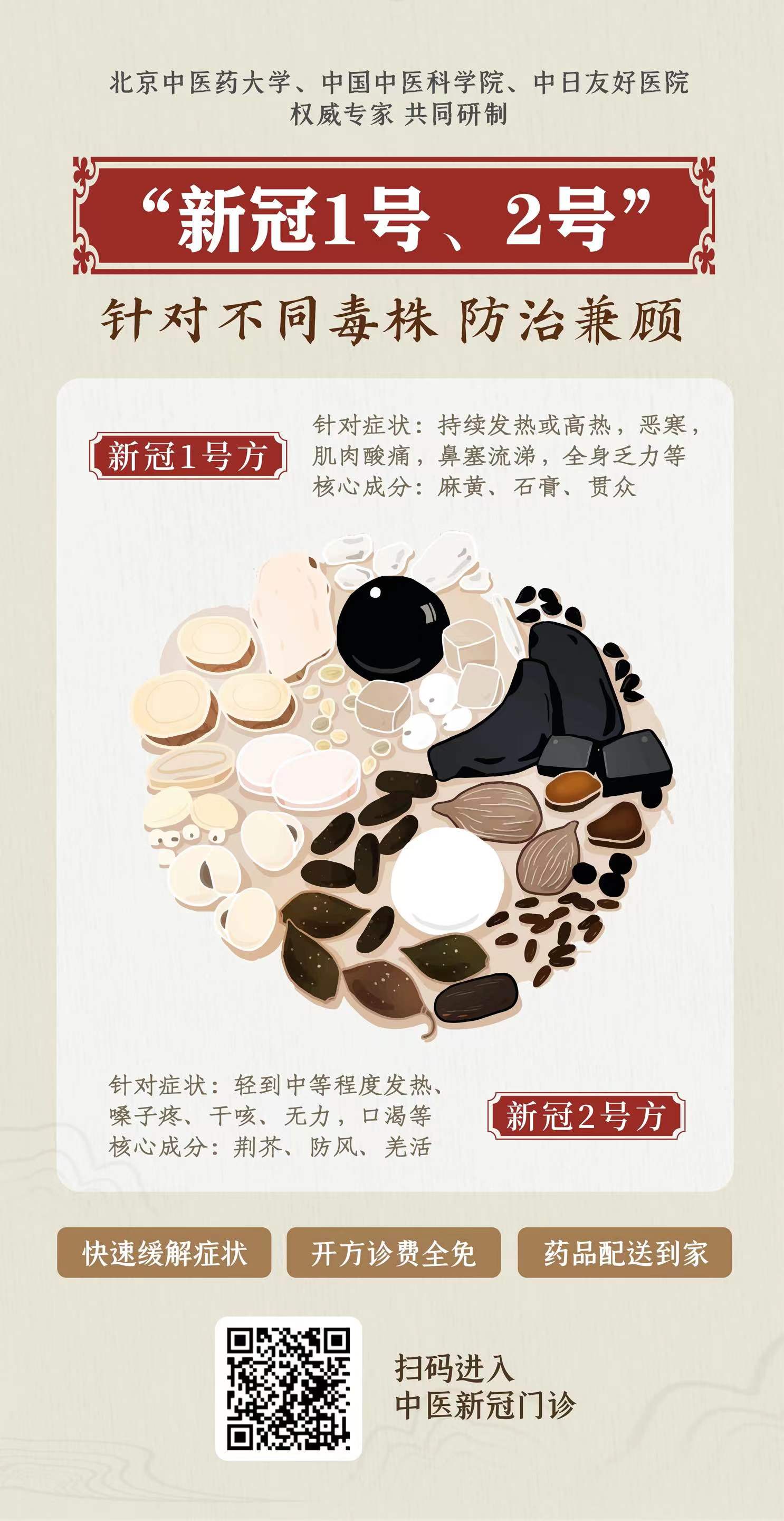 由北京中醫(yī)藥大學(xué)、中國(guó)中醫(yī)科學(xué)院、中日友好醫(yī)院三位著名中醫(yī)專家聯(lián)合推出的新冠1號(hào)、新冠2號(hào)中藥方劑來(lái)了,“全國(guó)居家醫(yī)療保障平臺(tái)”中醫(yī)新冠門(mén)診專業(yè)醫(yī)生在線提供對(duì)癥治療。