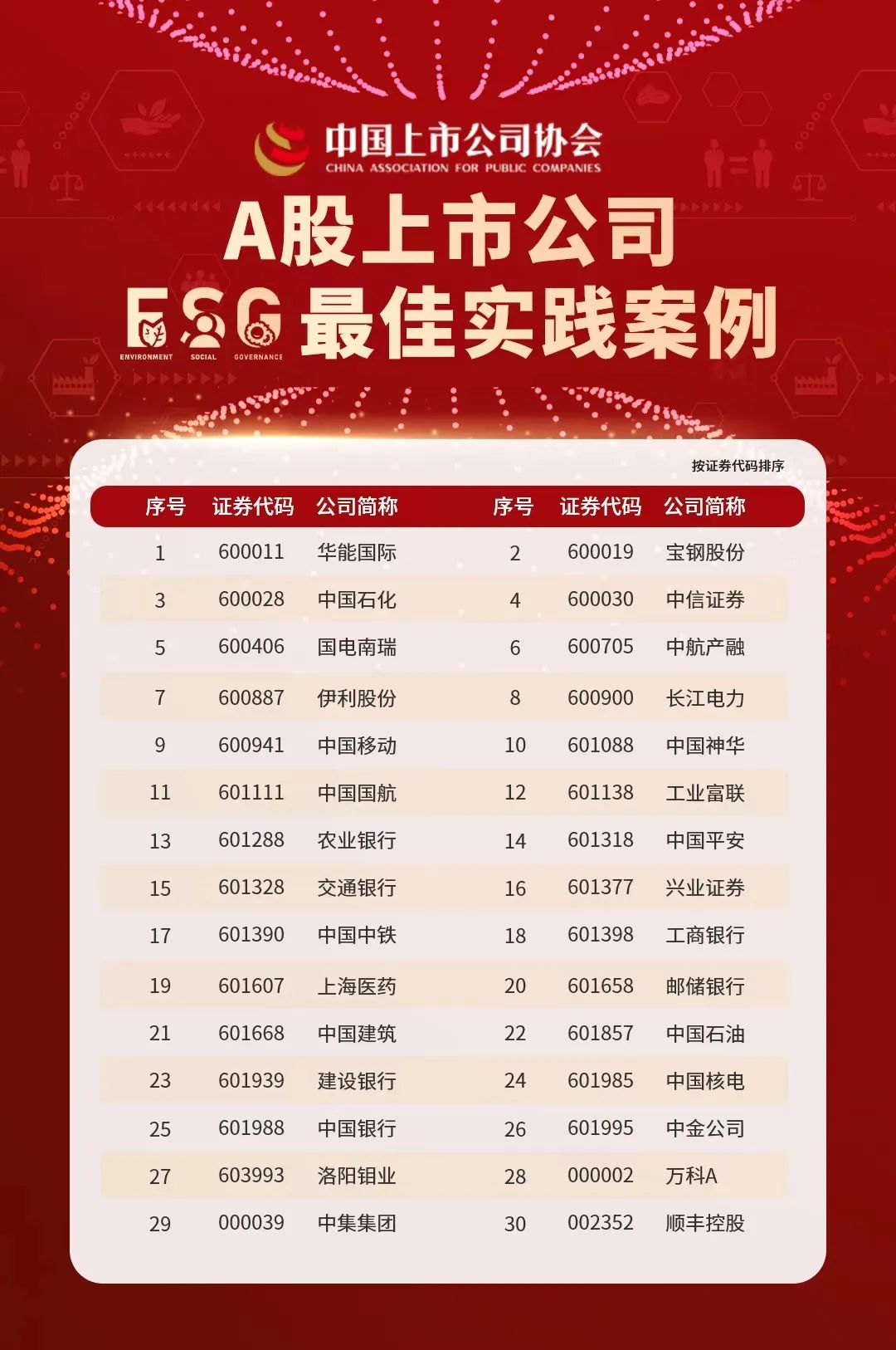 A股上市公司ESG最佳實踐案例,是中國上市公司協(xié)會在2022年9月份評選出的《上市公司ESG優(yōu)秀實踐案例》基礎(chǔ)上,組織ESG專業(yè)委員會依據(jù)四大維度20個一級指標(biāo)組織兩輪評審,從146家優(yōu)秀案例中最終評選出的30家最佳實踐案例。后續(xù)該入選信息將錄入證監(jiān)會證券期貨市場誠信檔案數(shù)據(jù)庫正面清單。