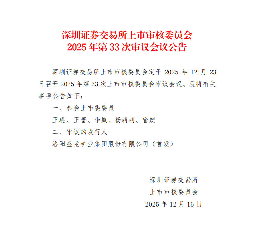 本報(bào)訊 (記者肖艷青)12月16日,深圳證券交易所公告顯示,深圳證券交易所上市審核委員會(huì)定于2025年12月23日召開(kāi)2025年第33次上市審核委員會(huì)審議會(huì)議,審議洛陽(yáng)盛龍礦業(yè)集團(tuán)股份有限公司(首發(fā))(以下簡(jiǎn)稱“盛龍股份”)。
