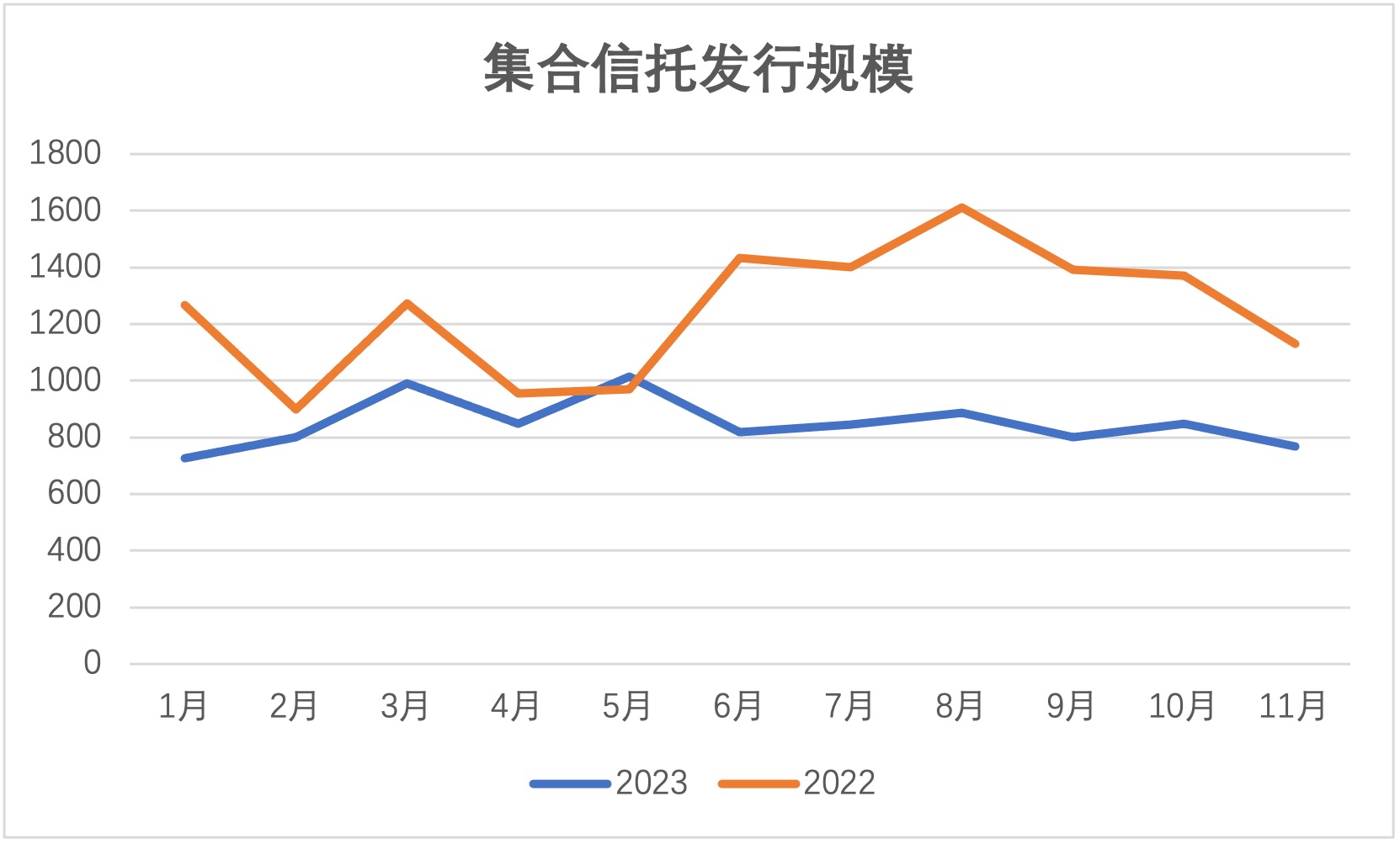 從發(fā)行規(guī)模上看,自2023年5月份達(dá)到1013.2億元的年內(nèi)發(fā)行規(guī)模高點(diǎn)后,此后各月發(fā)行規(guī)模呈現(xiàn)整體波動(dòng)下行趨勢(shì)。11月份,發(fā)行規(guī)模為768.43億元,這也是年內(nèi)第二次單月集合信托發(fā)行規(guī)模低于800億元,創(chuàng)下2023年2月份以來(lái)的最低點(diǎn)。另外值得注意的是,今年6月份以來(lái),各月發(fā)行規(guī)模較去年同比均下降超30%。