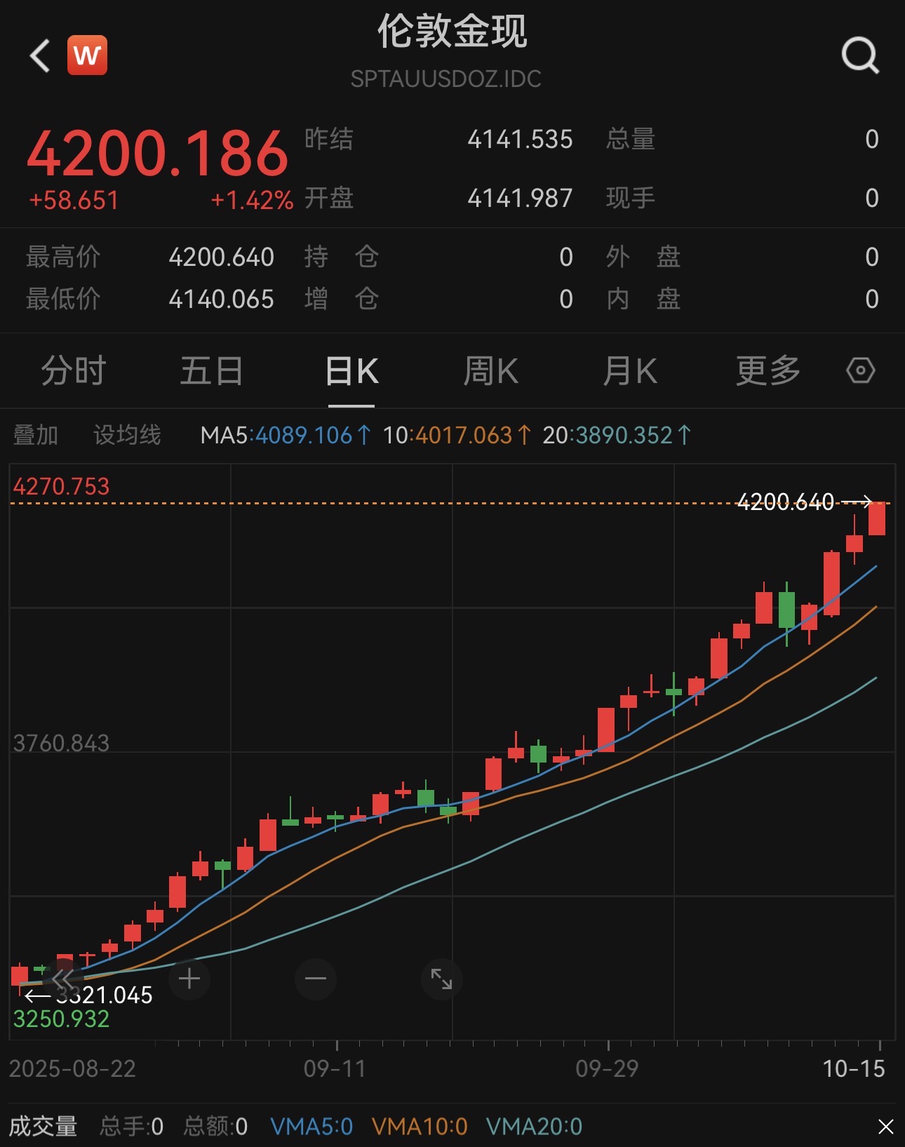 10月15日,國際現(xiàn)貨黃金價格持續(xù)走強(qiáng)。Wind數(shù)據(jù)顯示,倫敦金現(xiàn)貨價格歷史首次突破4200美元/盎司關(guān)口,日內(nèi)漲超1.4%。