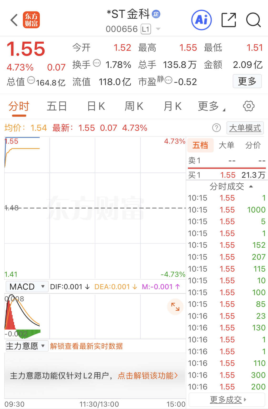 12月16日,*ST金科股價開盤大幅拉升,最終封于漲停,最新股價報1.55元/股,市值164.8億元。12月12日、12月15日、12月16日,該個股股價已連續(xù)三個交易日持續(xù)上漲,累計漲幅6.16%。