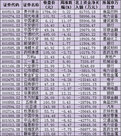 資金方面,北向資金3日均呈流出狀態(tài),累計凈賣出金額達(dá)65.57億元。從前十大成交活躍股來看,本周,貴州茅臺、陽光電源、中國建筑、平安銀行等4只個股,北向資金凈買入金額均超5億元。另外,恒瑞醫(yī)藥、贛鋒鋰業(yè)等個股遭北向資金凈賣出金額均超5億元。