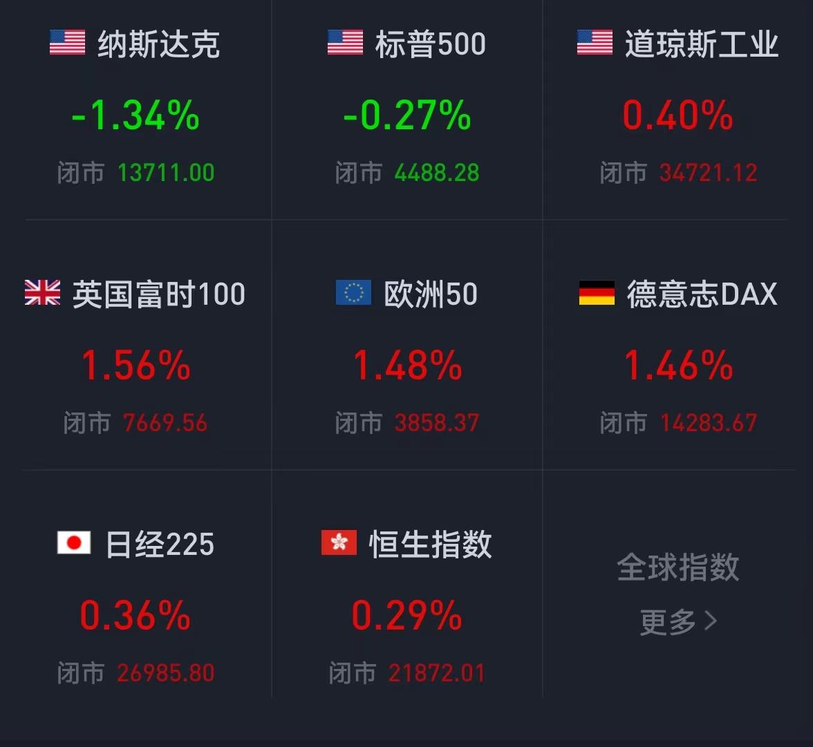 周五,歐股收盤全線上漲,德國DAX指數(shù)漲1.46%報14283.67點,法國CAC40指數(shù)漲1.34%報6548.22點,英國富時100指數(shù)漲1.56%報7669.56點。