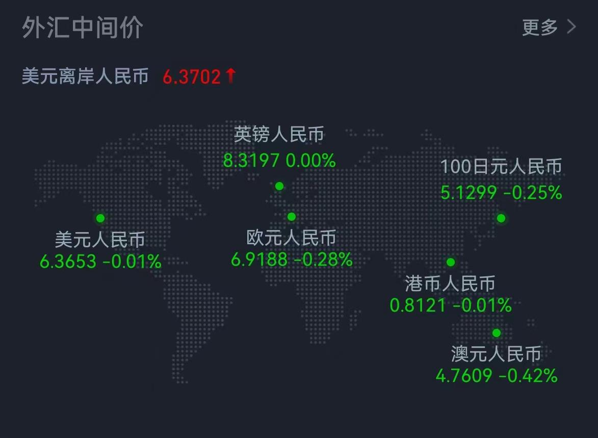 周五人民幣兌美元中間價報6.3653,調(diào)升6個基點,本周累計調(diào)貶144個基點。在岸人民幣兌美元16:30收盤報6.3637,較上一交易日跌3個基點,本周累跌17個基點。
