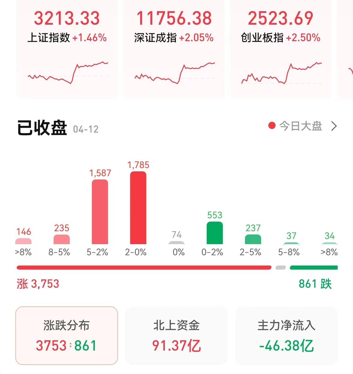 周二,A股三大指數(shù)集體漲超1%,截至收盤,上證指數(shù)漲1.46%報3213.33點,深證成指漲2.05%報11756.38點,創(chuàng)業(yè)板指漲2.5%報2523.69點,兩市合計成交額9165億元;北向資金凈買入91.37億元。