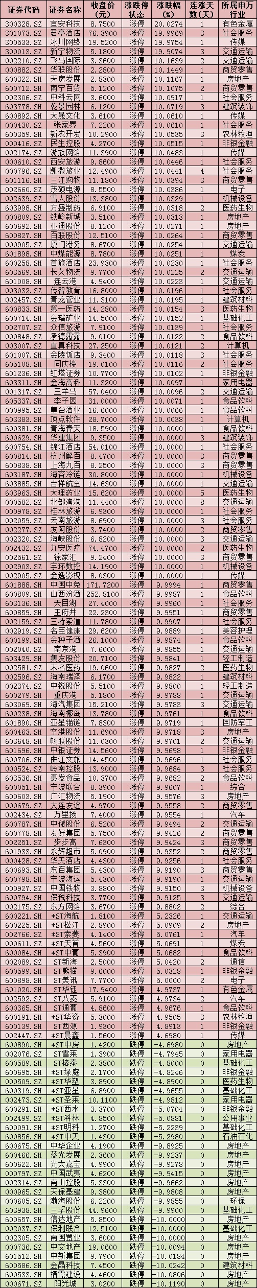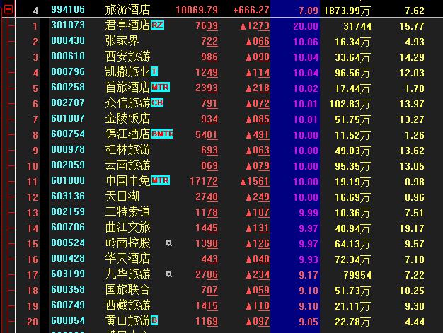 周二,住宿餐飲板塊和旅游酒店板塊聯(lián)袂爆發(fā),截至收盤漲幅分別達9.83%和7.09%。具體來看,有16只旅游股直沖漲停,君亭酒店20CM漲停。