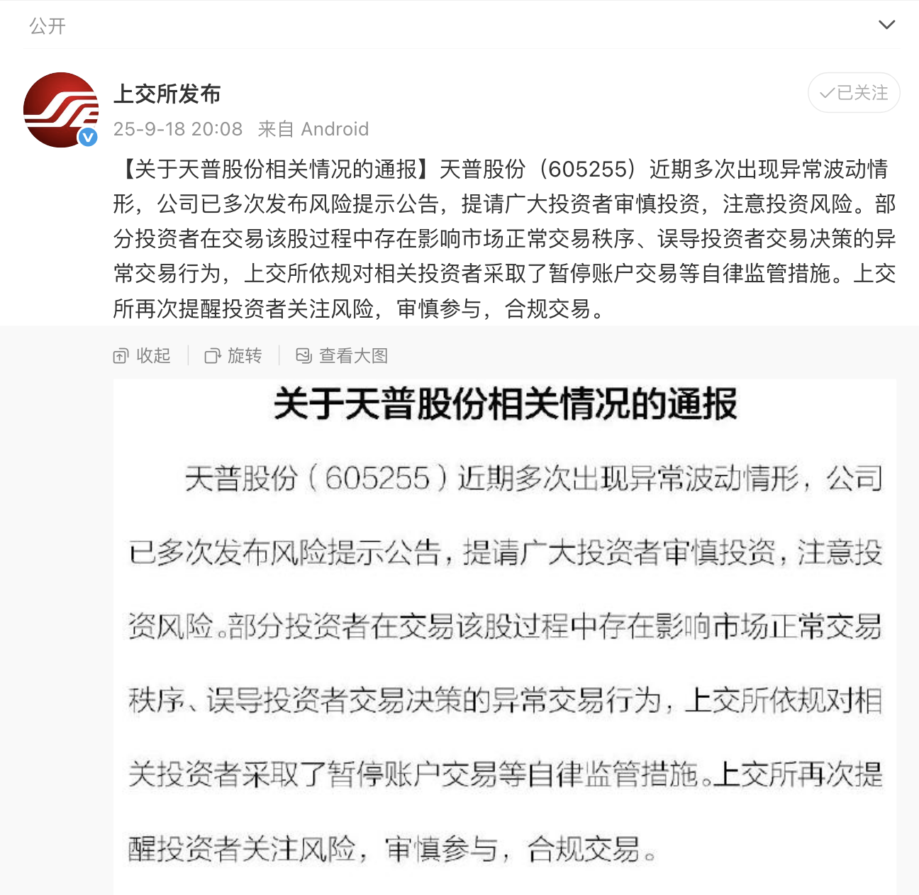本報訊 (記者毛藝融)9月18日,上交所發(fā)布關于寧波市天普橡膠科技股份有限公司(以下簡稱“天普股份”)相關情況的通報。通報顯示,天普股份近期多次出現(xiàn)異常波動情形,公司已多次發(fā)布風險提示公告,提請廣大投資者審慎投資,注意投資風險。部分投資者在交易該股過程中存在影響市場正常交易秩序、誤導投資者交易決策的異常交易行為,上交所依規(guī)對相關投資者采取了暫停賬戶交易等自律監(jiān)管措施。上交所再次提醒投資者關注風險,審慎參與,合規(guī)交易。