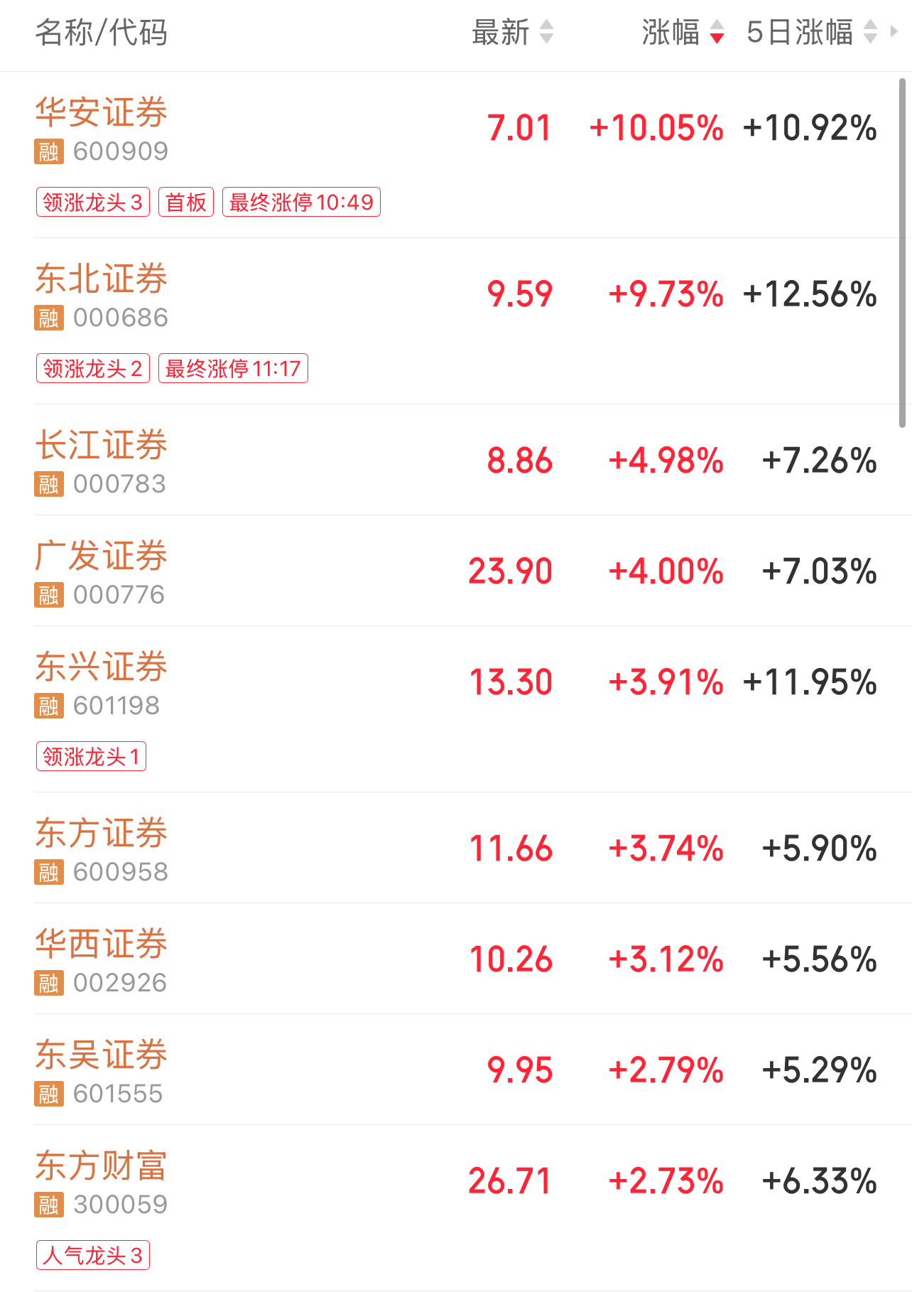 截至10月29日午間收盤,市場交投活躍,上證指數(shù)小幅上漲0.37%,報收于4002.83點。素有“牛市旗手”之稱的證券板塊整體表現(xiàn)亮眼,漲幅超過2%。其中,華安證券表現(xiàn)尤為突出,直接漲停封板;東北證券漲幅也超過9%;廣發(fā)證券、長江證券等個股漲幅均超過4%,證券板塊內(nèi)個股呈現(xiàn)出普漲態(tài)勢,市場熱度明顯提升。