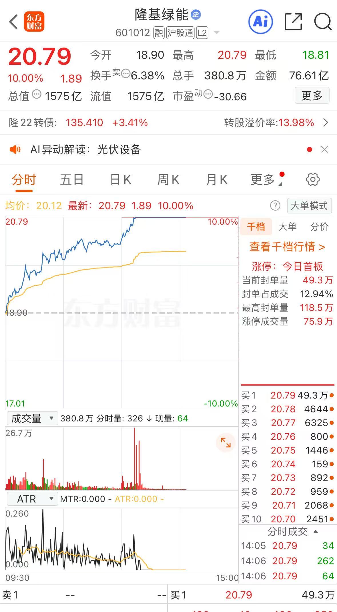 截至14點,東方財富數(shù)據(jù)顯示,從板塊來看,午后光伏設(shè)備以4%的漲幅躍居行業(yè)板塊之首,成分股中光伏龍頭企業(yè)隆基綠能“10CM”漲停,陽光能源漲超15%、通威股份漲超9%逼近漲停,大全能源、德業(yè)股份等大市值個股也隨之大漲,此外,阿特斯、弘元綠能等多只個股紛紛漲停。