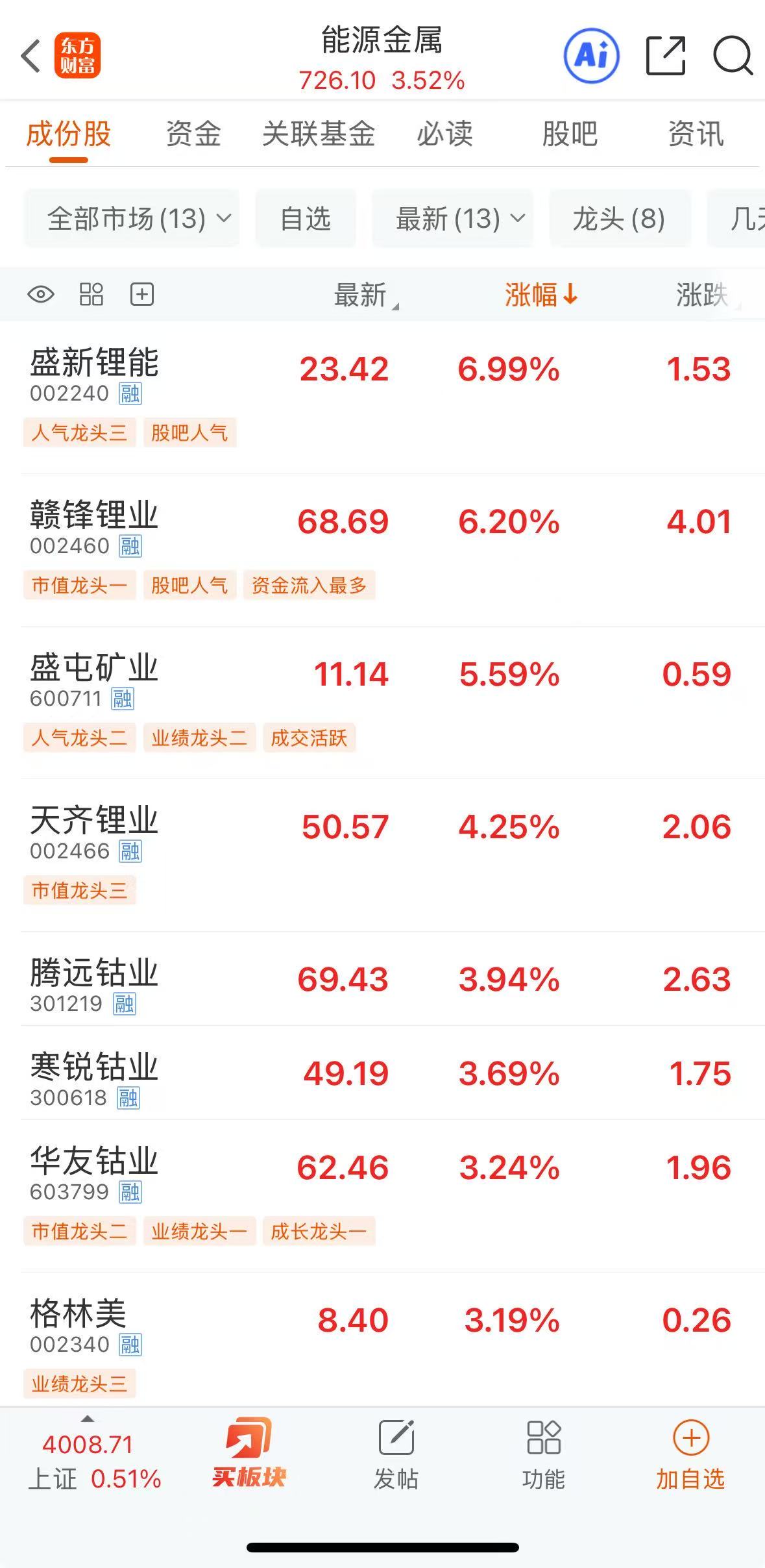 除光伏設(shè)備板塊外,鋰電板塊今日盤中表現(xiàn)也不俗。東方財富能源金屬板塊13只個股悉數(shù)飄紅,其中贛鋒鋰業(yè)、盛新鋰能漲超6%,天齊鋰業(yè)、盛屯礦業(yè)等個股跟漲。
