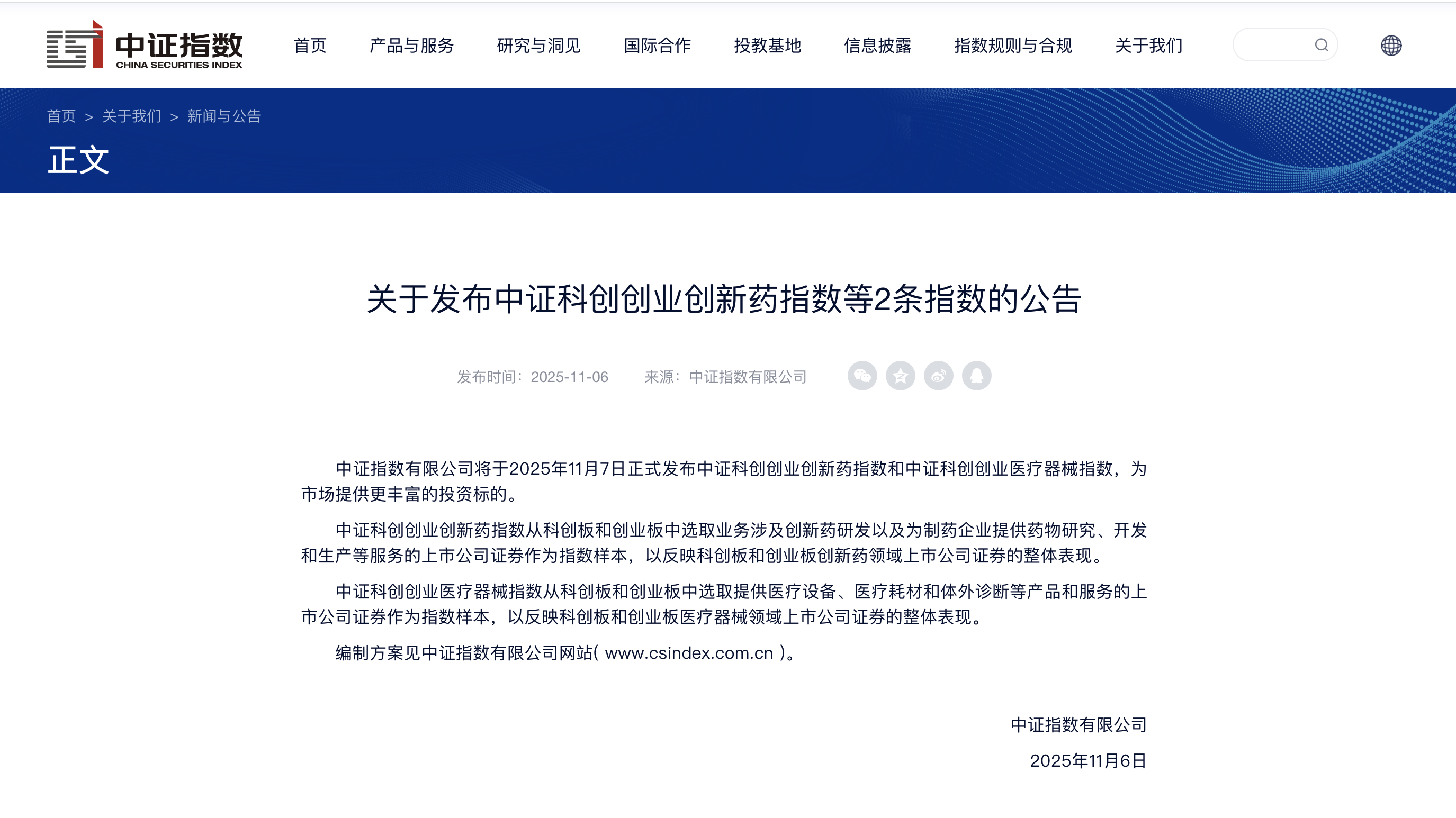 本報(bào)訊 (記者毛藝融)11月6日,中證指數(shù)有限公司公告稱,將于2025年11月7日正式發(fā)布中證科創(chuàng)創(chuàng)業(yè)創(chuàng)新藥指數(shù)和中證科創(chuàng)創(chuàng)業(yè)醫(yī)療器械指數(shù),為市場(chǎng)提供更豐富的投資標(biāo)的。