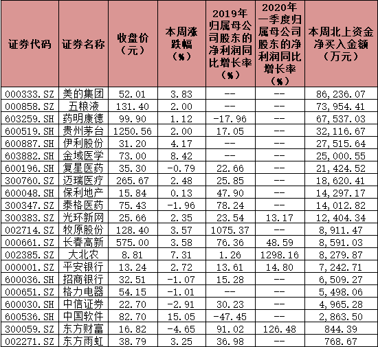進(jìn)一步梳理發(fā)現(xiàn),截至4月26日,北上資金本周凈買入的21只活躍股中,有16家公司已披露2019年年報(bào),其中,14家公司2019年凈利潤(rùn)實(shí)現(xiàn)同比增長(zhǎng),牧原股份2019年凈利潤(rùn)同比增幅最高,達(dá)到1075.37%。此外,5家公司披露2020年一季報(bào)業(yè)績(jī)均實(shí)現(xiàn)凈利潤(rùn)同比增長(zhǎng),大北農(nóng)一季度凈利潤(rùn)同比增長(zhǎng)高達(dá)1298.16%,緊隨其后的東方財(cái)富一季度凈利潤(rùn)也實(shí)現(xiàn)同比翻番,達(dá)到126.48%。
