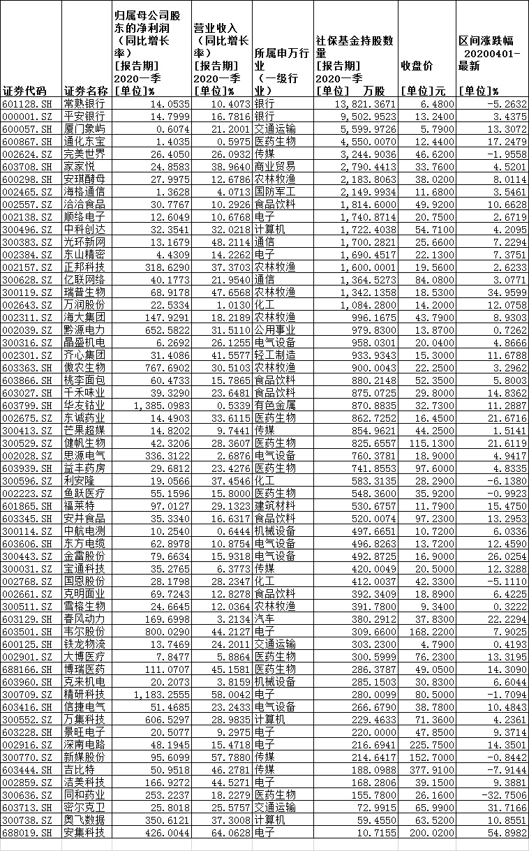業(yè)績預(yù)增股的出色表現(xiàn),無疑受到機(jī)構(gòu)資金的追捧。2020年一季報(bào)顯示,在上述222家雙增長公司中,包括常熟銀行、平安銀行、廈門象嶼、通化東寶和完美世界等在內(nèi)的59家公司的前十大流通股股東名單中均有社?;瓞F(xiàn)身,占比26.6%。
