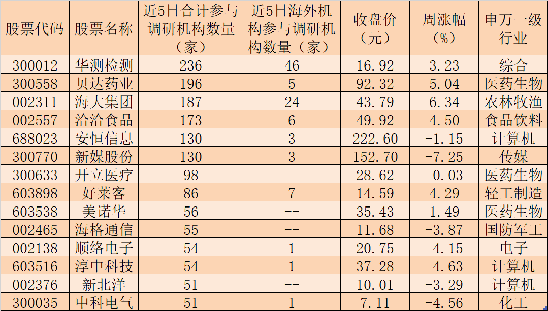 (表:近5日參與調(diào)研機(jī)構(gòu)超過(guò)50家的個(gè)股)