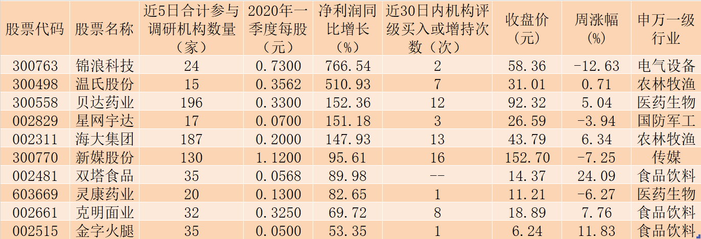 (表:近5日受到機(jī)構(gòu)調(diào)研且2020年一季報(bào)凈利潤(rùn)實(shí)現(xiàn)同比增長(zhǎng)超過(guò)50%個(gè)股)