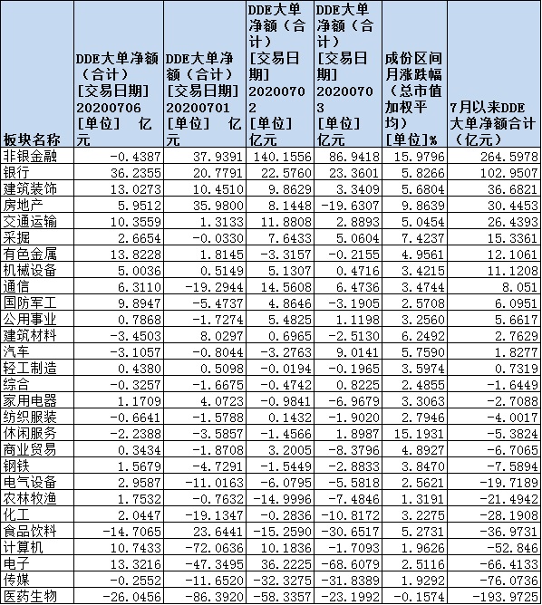 各路資金展開了調(diào)倉(cāng)換股。7月以來(lái)的4個(gè)交易日中,市場(chǎng)呈現(xiàn)出資金凈流入態(tài)勢(shì)。從申萬(wàn)一級(jí)行業(yè)來(lái)看,非銀金融和銀行等兩行業(yè)期間資金凈流入均超百億元,分別為264.6億元和102.9億元,合計(jì)達(dá)367.5億元,成為資金追捧的重點(diǎn)領(lǐng)域。而此前漲幅居前的醫(yī)藥生物行業(yè)期間累計(jì)資金凈流出達(dá)193.9億元。