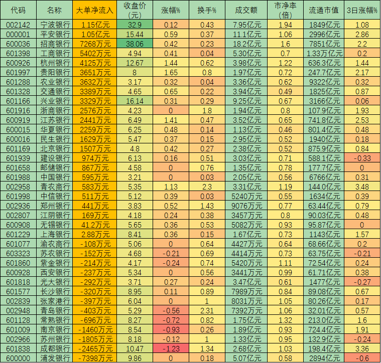 具體來看,36只交易的銀行股中,有23只呈大單資金凈流入,占比63.89%,其中,包括寧波銀行(1.15億元)、平安銀行(1.05億元)、招商銀行(7268萬元)等在內(nèi)的14只個股凈流入額均超1000萬元,合計凈流入6.32億元。