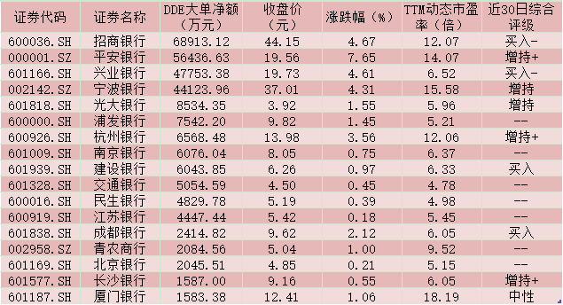 表:周三銀行板塊大單資金凈買入超1000萬元個股一覽