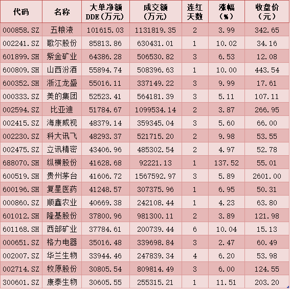 一、2月10日DDE大單資金凈買入TOP20
