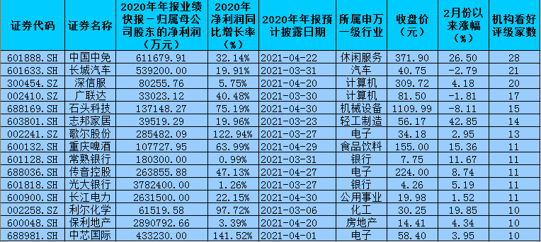 的確,自A股進(jìn)入年報(bào)披露期之后,核心資產(chǎn)業(yè)績表現(xiàn)對(duì)股價(jià)的傳導(dǎo)在市場中變得極為敏感,機(jī)構(gòu)的選股壓力明顯增大。在這一背景下,上述171家2020年凈利潤實(shí)現(xiàn)同比增長的公司中,仍有86家公司最近1個(gè)月內(nèi)被機(jī)構(gòu)給予“買入”或“增持”等看好評(píng)級(jí),其中,15家公司機(jī)構(gòu)看好評(píng)級(jí)家數(shù)在10家以上,中國中免、長城汽車、深信服等3只個(gè)股機(jī)構(gòu)看好評(píng)級(jí)家數(shù)均在20家及以上,分別為28家、21家、20家。