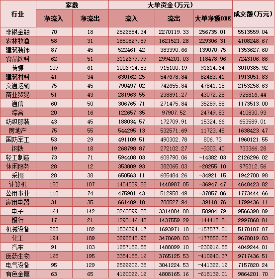 二、周五(2月19日)申萬(wàn)一級(jí)行業(yè)大單資金流向