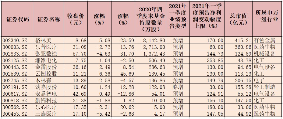 表:去年四季度末基金持倉并披露2021年一季度業(yè)績預(yù)告的公司一覽