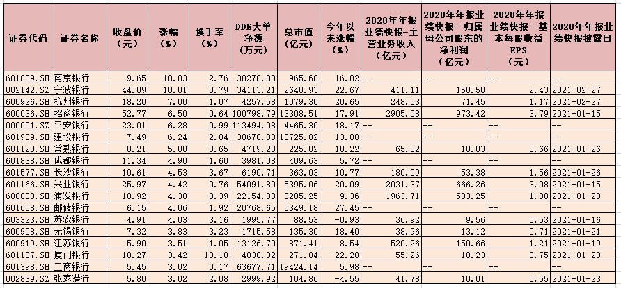 與此同時(shí),銀行股的突出表現(xiàn)也得到了良好業(yè)績(jī)的支持,截至3月3日,已有22家上市銀行披露了2020年年度業(yè)績(jī)快報(bào),其中20家公司報(bào)告期內(nèi)實(shí)現(xiàn)凈利潤(rùn)同比增長(zhǎng),占比超九成。具體來(lái)看,寧波銀行、杭州銀行、廈門(mén)銀行、長(zhǎng)沙銀行等4家公司2020年全年凈利潤(rùn)同比增長(zhǎng)均超5%,分別為9.73%,8.22%,6.55%,5.08%。此外,招商銀行、興業(yè)銀行、浦發(fā)銀行、中信銀行、光大銀行等5家銀行2020年?duì)I業(yè)收入均超1000億元,分別為2905.08億元、2031.37億元、1963.71億元、1947.31億元、1425.35億元,歸屬母公司股東的凈利潤(rùn)分別為973.42億元、666.26億元、583.25億元、489.80億元、378.24億元。