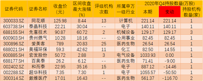 具體來看,新進(jìn)增持方面,截至2020年四季度末,QFII新進(jìn)同花順、泰晶科技、先惠技術(shù)、貴州燃?xì)?、愛美客?只個(gè)股,并對(duì)奧福環(huán)保進(jìn)行繼續(xù)加倉操作,QFII增持?jǐn)?shù)量為14.55萬股,最新持股數(shù)量為82.50萬股。此外,還持有宏發(fā)股份1033.93萬股未動(dòng),對(duì)百奧泰、和而泰、超華科技和戴維醫(yī)療則有所減倉。