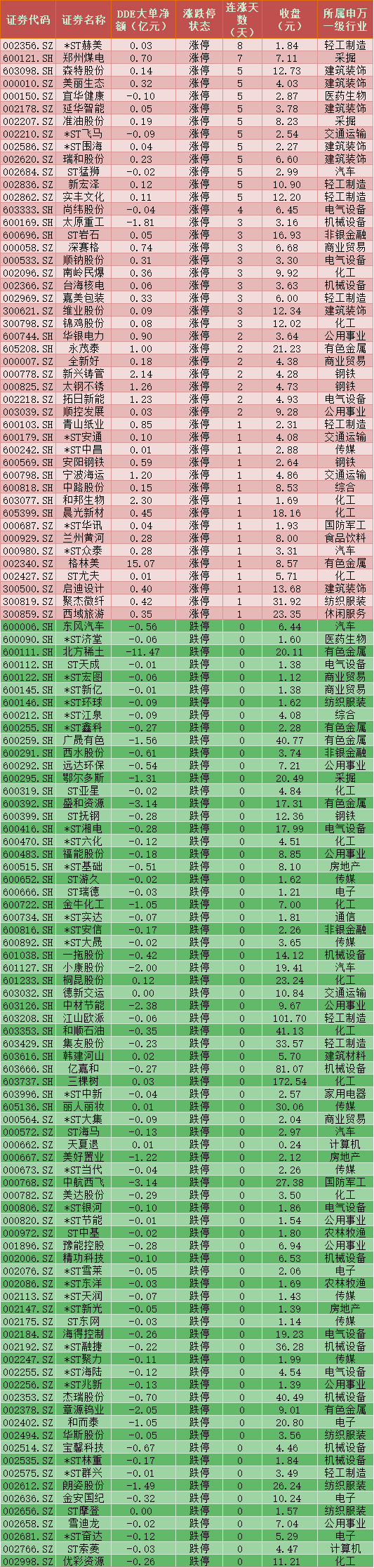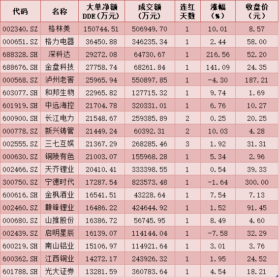 一、周二(3月9日)DDE大單資金凈買入TOP20